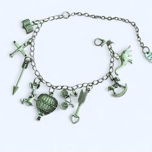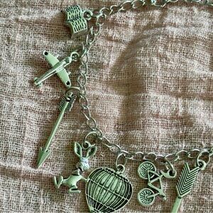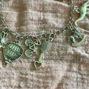 Silver charm bracelet featuring unique pendants including a rabbit, arrow, and hot air balloon.