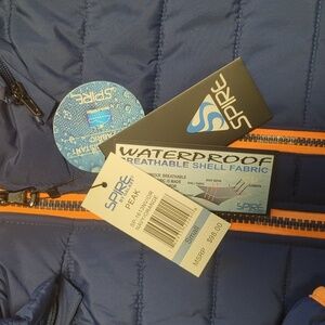 NWT Great lightweight waterproof jacket by Spire. Polyester lining. Navy blue with orange accents and orange lining. 4 pockets: 3 zippered on the front and 1 on the inside. Hood has adjustable straps and can be removed. Length from shoulder is 27". Zippered from armpit: 22". Size: S. Smoke and animal free home.