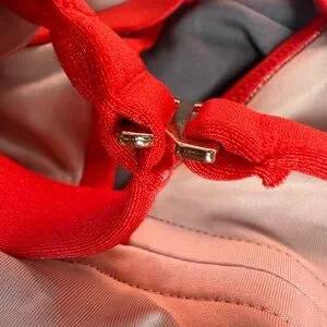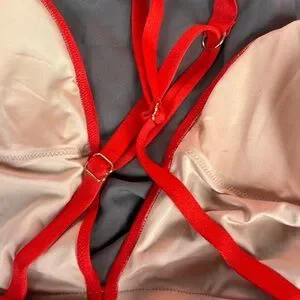 Striking red plunge bling strap swimsuit one-piece with cross-back design. Features Victoria's Secret logo on straps. Size medium. Some wrinkles in photos from storage but it's never been worn. New without tags VS bling strap swimsuit like the bling strap bra collection.