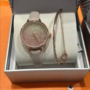Elegant watch with sparkling dial. Comes with a delicate rose gold bracelet. Perfect for any occasion.