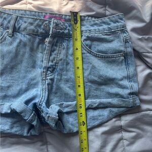 These Edikted jean shorts in a classic blue hue offer a relaxed, casual vibe. Perfect for laid-back days, they provide a stylish, worn-in look that pairs effortlessly with any top. Worn a few times. Rolled up bottoms with button down closure.