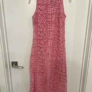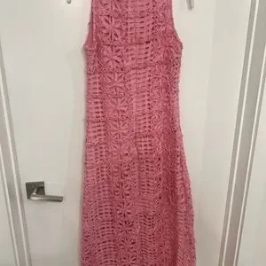 Elegant pink crochet maxi dress. Sleeveless design. Perfect for summer occasions.