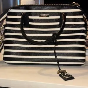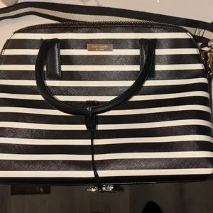 Elegant satchel with bold black and white stripes. Features sturdy handles and a sleek design. Ideal for versatile styling. Maybe used 1, I did put a strap on it, the strap is not Kate spade. Purse is so clean inside and out.