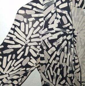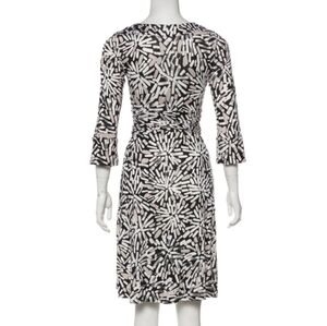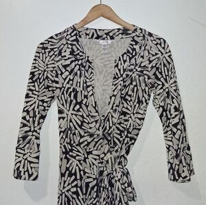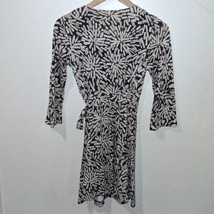 Beautiful black, white & gray wrap dress features a striking pattern, perfect for any occasion. Its sophisticated design offers a flattering fit, making it a must-have addition to your wardrobe.