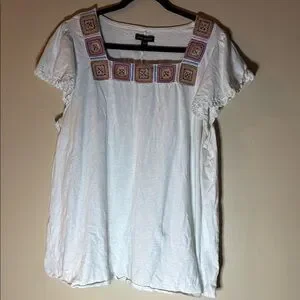 Discover the elegance of the Lane Bryant White Flutter Sleeve Blouse, designed with a boxy silhouette and embellished neckline. The cap sleeves add a delicate touch, while the soft fabric ensures all-day comfort. Perfect for both casual and stylish occasions, this top is a versatile addition to your wardrobe.