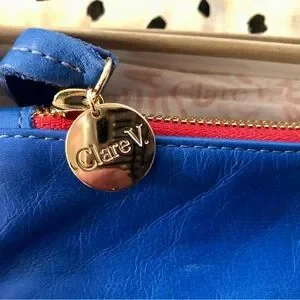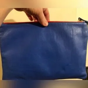 ๐ด๐ด๐ด LIKE NEW CLARE V โOUIโ BLUE & WHITE LARGE LEATHER CLUTCH W/ DUST BAG & BOX! ๐คฉ