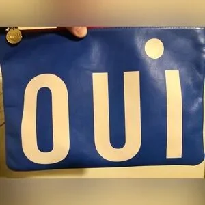 ๐๐ด CLARE V โOUIโ BLUE & WHITE LARGE LEATHER CLUTCH W/ DUST BAG/BOX! ๐