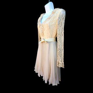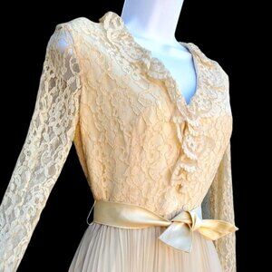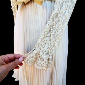 50s Chantilly Lace Beige Chiffon Vintage Dress XS Long Sleeve Pleated Wedding