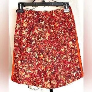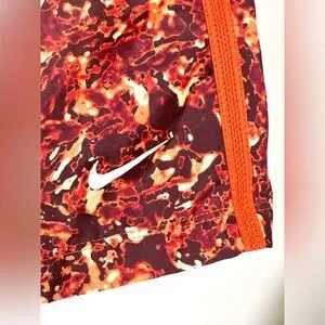 These Nike training athletic shorts are for boy's size XL. They feature a unique orange/brown fiery pattern. Standard fit. Pockets with mesh lining on either side. Inner orange drawstring. 100% Polyester, machine wash/tumble dry. Brand new with tags.