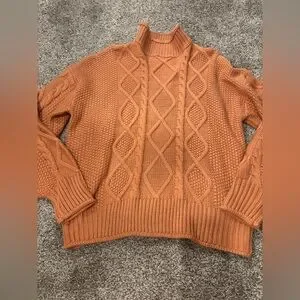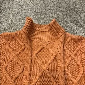 Stay cozy and stylish with this orange cable knit sweater. Perfect for layering in cooler weather.