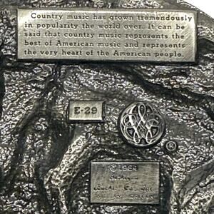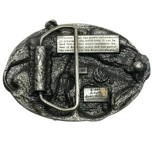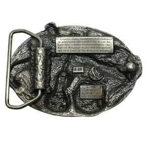 Vintage 1984 pewter belt buckle by Siskiyou Buckle Co., Inc. of Williams, Oregon. Features “Country Music” across a banner with banjo and fiddle details over a USA map. Back is inscribed with a quote celebrating country music’s legacy, marked E-29. Measures approximately 3.1”W x 2.4”H. Manufactured by The Great American Buckle Co., in the USA.