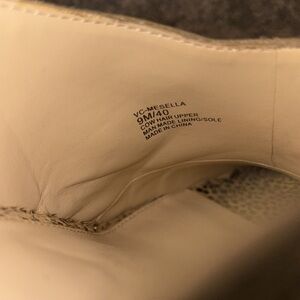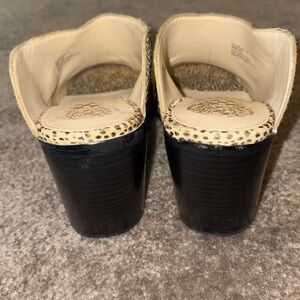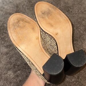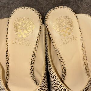 Leopard print peep toe mules by Vince Camuto, size 9. Cow hair on upper part. Block heel. 3.5” heel. Does not include box.