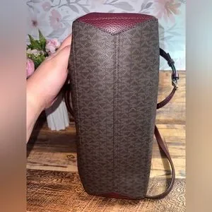 This Michael Kors shoulder bag showcases a sophisticated blend of red leather accents and a classic brown monogram print. Designed with structured sides, it offers both style and practicality for everyday use. The silver-toned MK charm adds a touch of elegance to this timeless accessory.