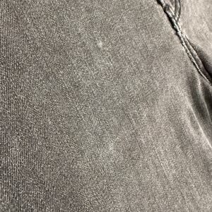 There is some discoloration, creating a stonewashed look. The hem has been altered with a small split seam added.