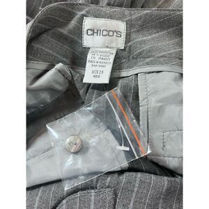 Elevate your workwear wardrobe with these Chico's gray pinstriped wide-leg pants. The pants feature a flat front, mid-rise waist, and a comfortable regular fit. The closure includes both a zip and button for added security.