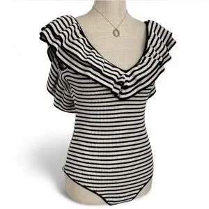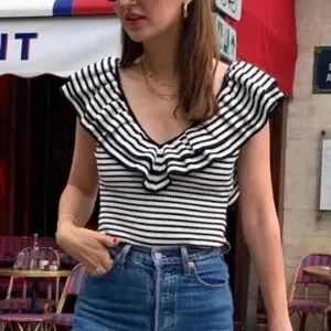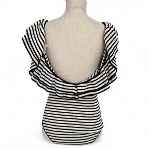 Sezane Isabella bodysuit in Black & white stripes with ruffles and v-neckline