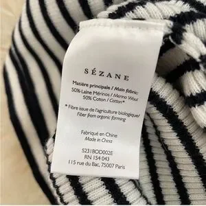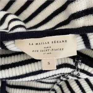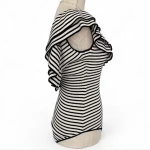 black and white stripes, ruffled neckline, v-neck, feminine, Parisian chic, merino wool blend, classic style, high quality, modern elegance, French-inspired