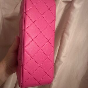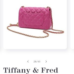 Worn once, crossbody bag by Tiffany and Fred. It is hot/ bright pink or fuschia color, made of sheepskin leather. Has an exterior pocket, twist lock closure, cotton/ textile lining inside with zippered pocket. The leather and metal chain strap length is adjustable. Please see my other items, I listed this purse in other colors!