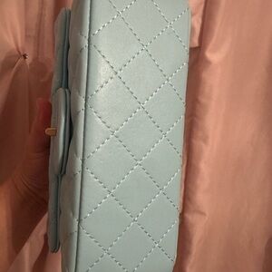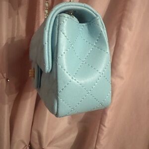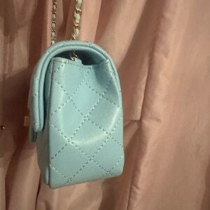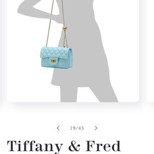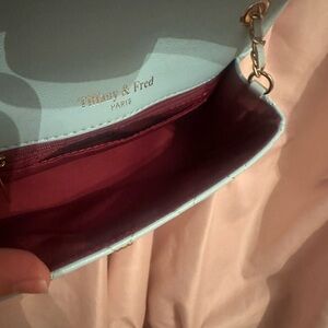Never worn ( or worn one time max), crossbody bag by Tiffany and Fred. It is light, pastel, baby, or sky blue color, made of sheepskin leather. Has an exterior pocket, twist lock closure, cotton/ textile lining inside with zippered pocket. The leather and metal chain strap length is adjustable. Please see my other items, I listed this purse in other colors!