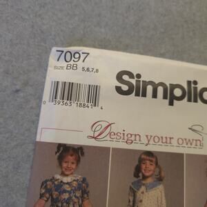 Simplicity 7097 sewing pattern for girls’ dresses, size BB (5, 6, 7, 8). Offers 9 versatile styles in one easy pattern—includes puff sleeves, collars, pockets, and various skirt options. Perfect for creating customized dresses for everyday wear or special occasions. Pattern appears uncut and factory folded.