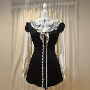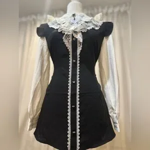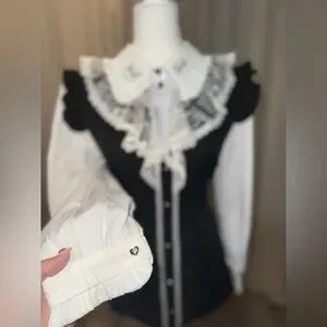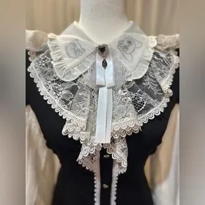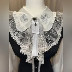 She designed and drew our mascot characters, Coco the black cat and Momo the lop bunny❤ This cute setup features a cute silver embroidery of Coco and Momo on the collar. They are very delicate and detailed, and we are really proud of them! It also features cute lace of lily of the valley on the chest part, and of course, pockets!