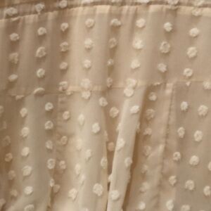Elegant cream dress by Entro. Features textured polka dot design. V-neck with button detail. Flowy sleeves and hem.