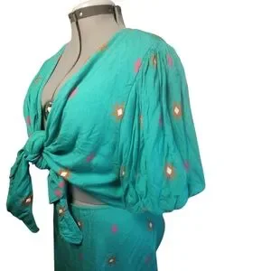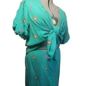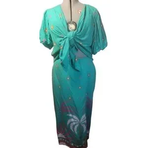 Size 1x. Excellent condition. Tie upper bodice. back has a waist keyhole and zipper. the bottom has a cute kick pleat