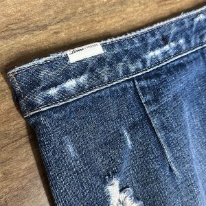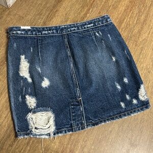 Authentic Lovers + Friends like new Ryder 100% cotton indigo blue denim revolve distressed mini size zip holey skirt in women’s size 26. Length 15 waist 15” B6
