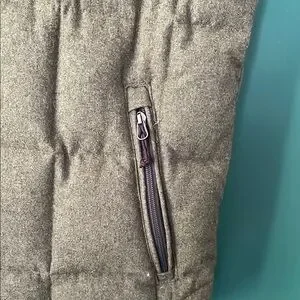 Stylish olive puffer vest. Perfect for layering. Features zip pockets and button closure.