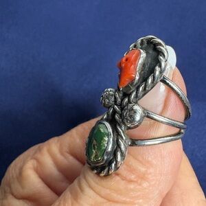 Beautiful vintage Sterling silver Native American inspired ring! This ring has beautiful turquoise and coral stones! Stamped 925. This is a beautifully preserved vintage ring! *****note******There is a small circular imperfection in the coral that resembles a hole. It’s impossible to tell if it’s just a natural hole, and due to its age, the information is not available. This does not take away from the uniqueness of this piece, but the photo attached shows this imperfection so please look at all the photos!****** This ring is a remarkable piece of Vintage jewelry, and definitely a collectors piece for all who love turquoise. Some of the patina was shined off, but a good deal remains and can be wiped clean by the buyer if they desire.
