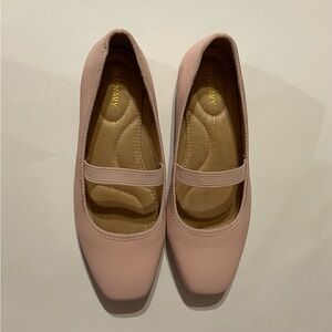 These Old Navy ballet flats feature a soft pink upper with a chic elastic strap for added style and comfort. The minimalist design and flat sole make them perfect for both casual and business casual settings. Their squared-off toe box adds a contemporary touch to this elegant footwear choice. Gently worn, for one season. Very comfortable, size 6.