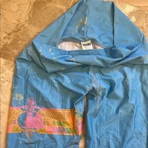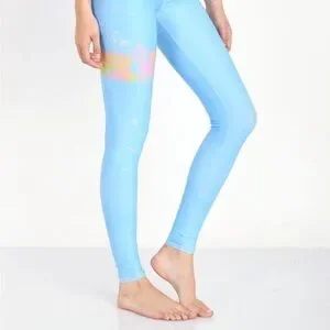 Vibrant blue leggings with pink accents. Comfortable and stylish. Perfect for yoga or casual wear.
