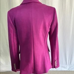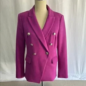 Stylish fuchsia blazer with double-breasted design. Features elegant buttons and tailored fit. Ideal for adding vibrant flair to your outfit.