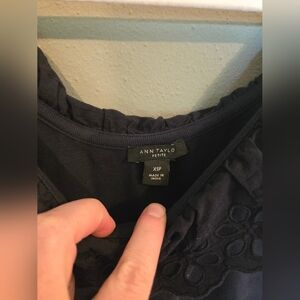 Elegant black sleeveless top featuring lace detail on the neckline. Perfect for any occasion.