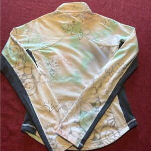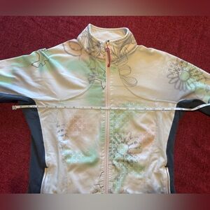 Lululemon Forme full zip up jacket, size 10. Beautiful subtle abstract floral print. Pastel colors on white with charcoal grey up side and under the sleeves. Stretchy performance fabric. Fitted flattering fit, full zip up closure, front zip pockets. Measurements laying flat 19” bust, 25.5” length (from collar).