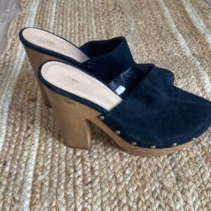 These look amazing on! The black suede high heal clog is such a fun way to dress up a bohemian look. These are in excellent condition. Ultra high heal about 4.5 inches