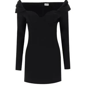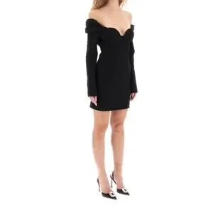 This stunning black bodycon dress by Magda Butrym features a sophisticated off-the-shoulder neckline and long sleeves, perfect for a cocktail night out. The fitted silhouette accentuates the figure, while the solid black fabric offers a sleek and elegant look.