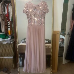 This elegant pink gown by Betsy & Adam features a crew neck and short flutter sleeves, making it perfect for weddings. The dress showcases a delicate lace bodice and a flowing maxi skirt, creating a graceful silhouette for special occasions.