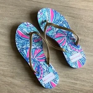 Lilly Pulitzer Vibrant Blue and Pink Flip Flops with Gold Straps