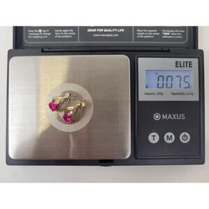 Gorgeous pair of teardrop diamond and ruby or topaz earrings. The color of the main stone is a red/pink. 10K yellow gold. The diamonds were tested as authentic by a professional jeweler in Yakima, Washington. Weighs .075 oz.