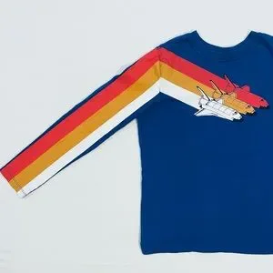 - Soft, brushed cotton jersey tee with awesome space shuttles blasting off from right cuff to chest, over to left sleeves screen print graphic on front