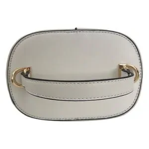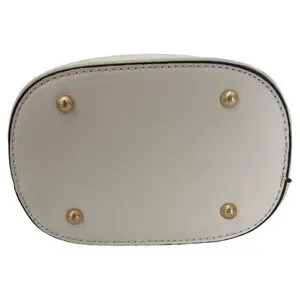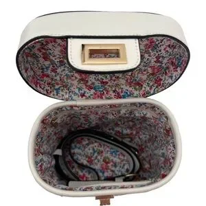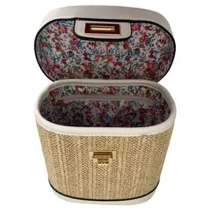 Chic handbag with a woven tan design and white accents. Features a gold clasp for a touch of elegance.