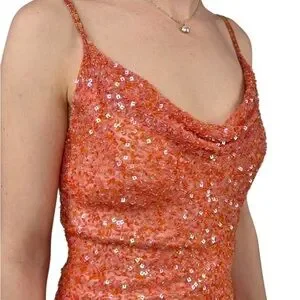 Shine in this stunning orange sequin floor length gown, perfect for any special occasion in color coral/orange.