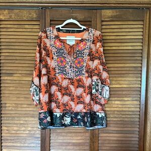 Embrace a bohemian vibe with this John Mark blouse, featuring a vibrant orange and black graphic design. The relaxed fit and flowing sleeves offer comfort, while the mandarin collar adds a touch of elegance. Perfect for casual outings, this top is a stylish addition to any wardrobe. Size large.