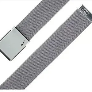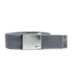 Stylish gray web belt with sleek silver buckle. Nike branding on buckle.