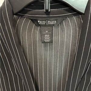 This elegant black blouse from White House Black Market features a stylish tie front and a distinctive sailor collar and button front. The lightweight fabric and classic design make it perfect for professional settings, offering a sophisticated and polished look.
