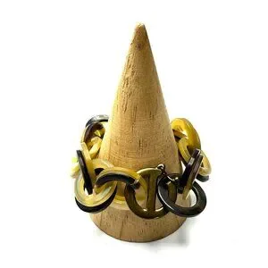 This exquisite carved horn chain link bracelet showcases YSL's bold experimentation with natural materials introduced in the 1980s that defined their innovative approach to luxury jewelry. Each interlocking link flows seamlessly together, showcasing sophisticated textures that feel both tribal and thoroughly modern. Note: Authentic spelled-out YVES SAINT LAURENT signature - characteristic of vintage YSL jewelry from this era.