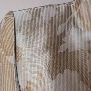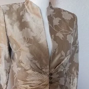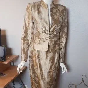 This elegant women's jacket and skirt set features a beautiful champagne colored floral pattern. Perfect for formal occasions, it combines style and sophistication. Jacket measures 17" p2p and 19" in length skirt measures 14" p2p at waist, 19" hips and 23" in length.