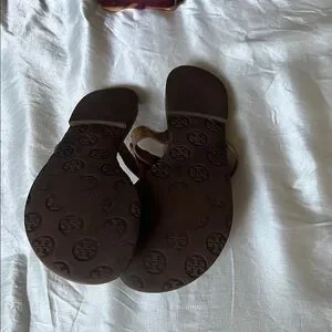 • Heel Height: ½” Elegant tan sandals featuring iconic Tory Burch logo. Ideal for everyday style.