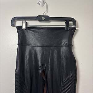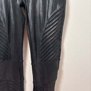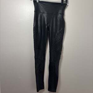 SPANX Women's Faux Leather Moto Leggings in black. These stylish high-waisted leggings feature a sleek faux leather finish with moto-inspired ribbing details on the thighs and knees. Perfect for adding an edgy touch to any outfit, from casual to dressy. Excellent pre-owned condition with no visible flaws.